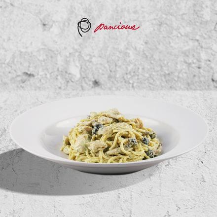 A mouth-watering pasta, dedicated to chicken and pesto lover
