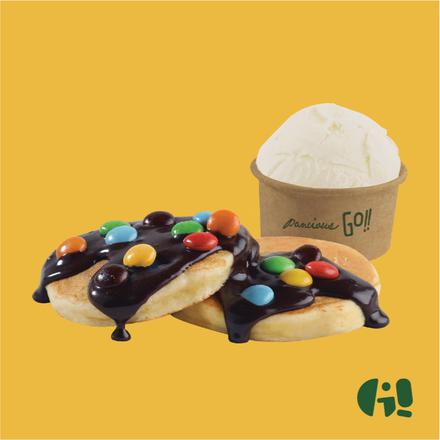 An indulgent dessert with chocolate fudge and homemade ice cream that brings pancake to the next level.