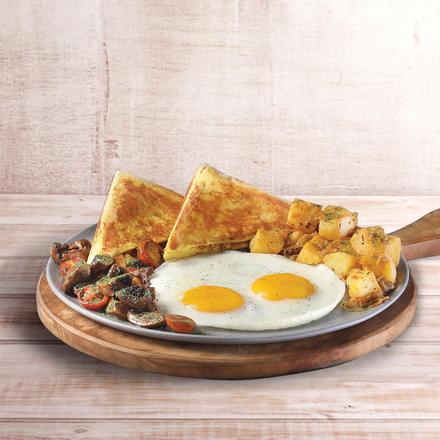 Wake up to a golden sunrise on your plate with a perfectly fried egg, herbs potato, sauteed mushroom and egg toasted bread