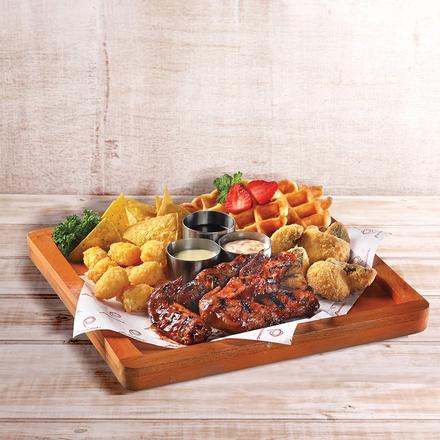 A winning combination of sweet and savory delights that consists of chicken wings, fried mushroom, tortilla chips, tater tots, and waffle. Perfect for sharing with friends or family