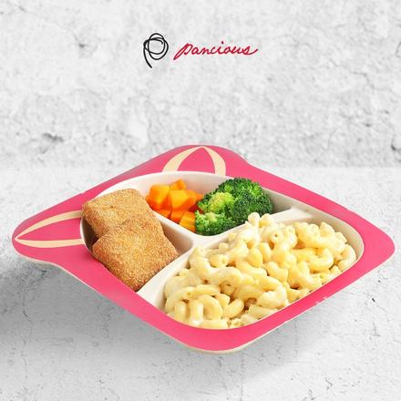 Creamy mac & cheese with crispy chicken nuggets and colorful veggie bites—munch time made fun!