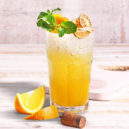 Orange juice, passion fruit, lemon, lime, mint leaves and carbonized water