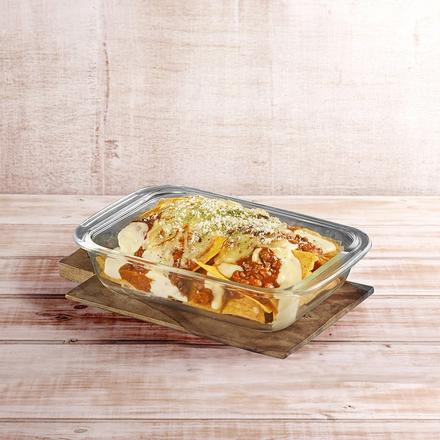 Our improved recipe of crispy tortilla chips, homemade cheese sauce, bolognaise sauce, topped with melted mozzarella and parmesan cheese