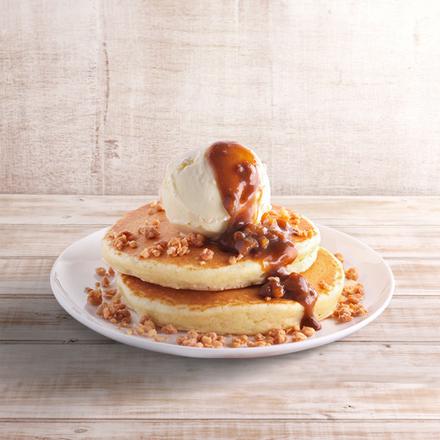 Special walnut sauce drizzled on top of the buttery pancakes and vanilla ice cream, completed with peanut crunch